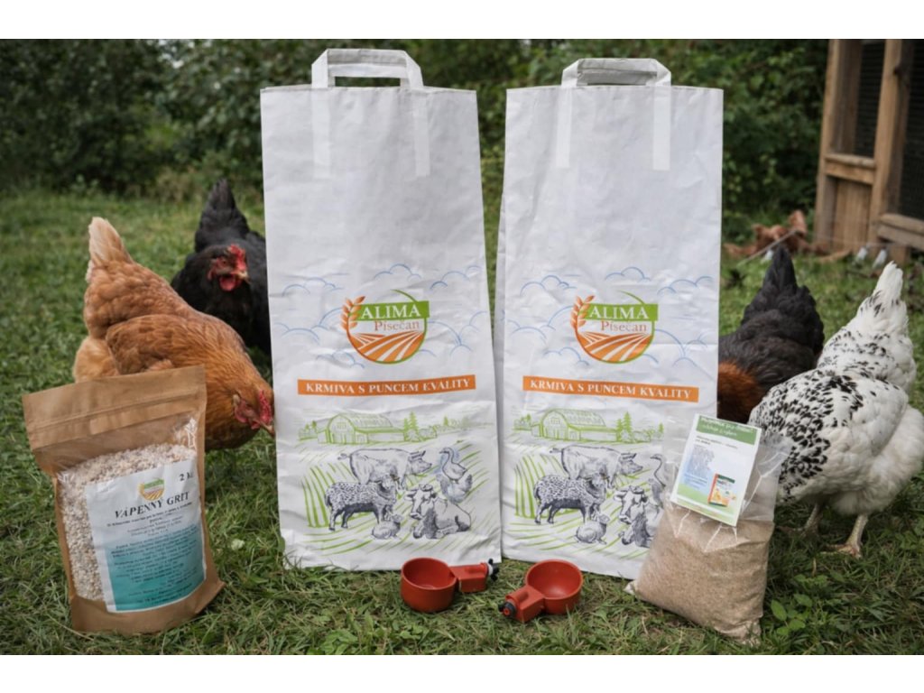 Kompletní granulované krmivo pro nosnice, vápenný grit, vitamíny a napáječky