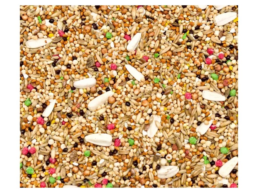 Složení : Bílá sezamová semínka, bílé proso, čirok, lněné semeno, čirok bílý, oves loupaný, chrastice kanárská, proso červené, proso černé, lnička setá, pohanka bílá, slunečnice bílá, grit míchaný, kukuřičné výlisky jemné, perila křovitá, vitaminizovaný piškot.